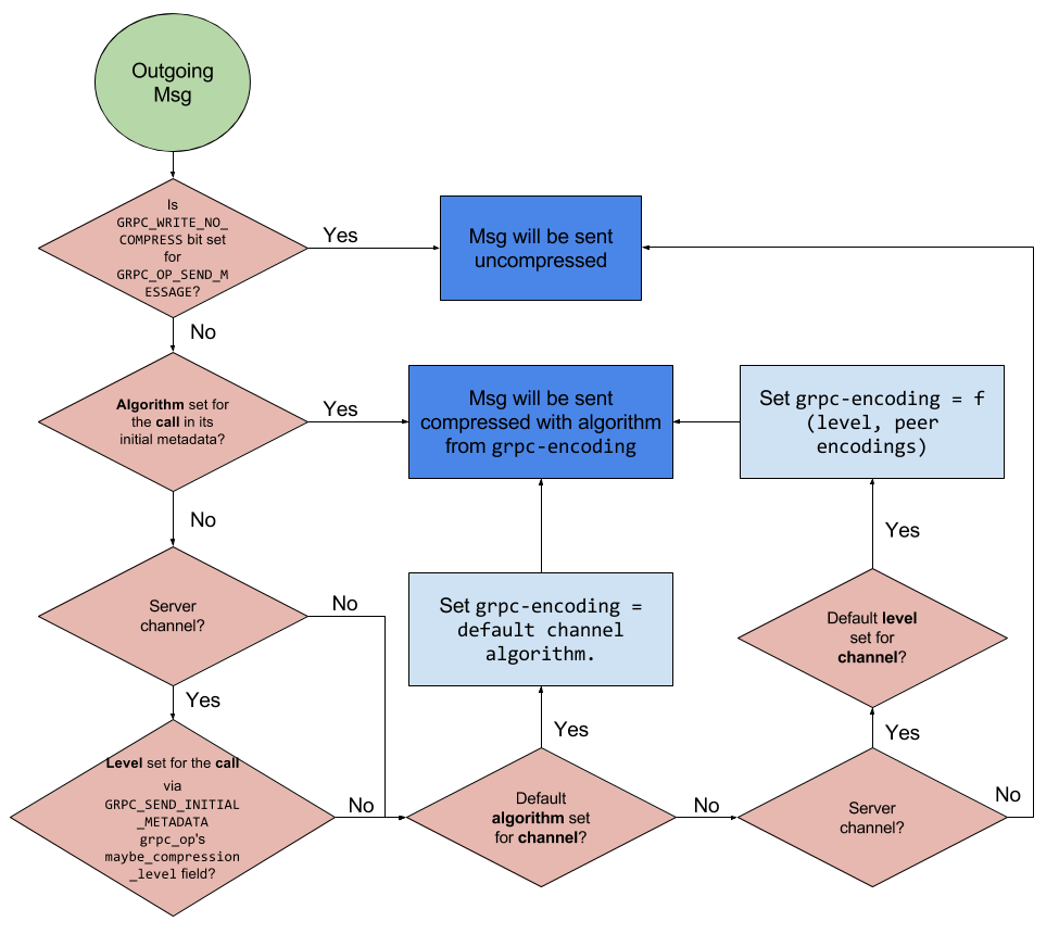 The following flowcharts depict the evolution of a message, both incoming and outgoing, irrespective of the client/server character of the call. Aspects still not symmetric between clients and servers (e.g. the use of compression levels) are explicitly marked. The in-detail textual description for the different scenarios is described in subsequent sections.